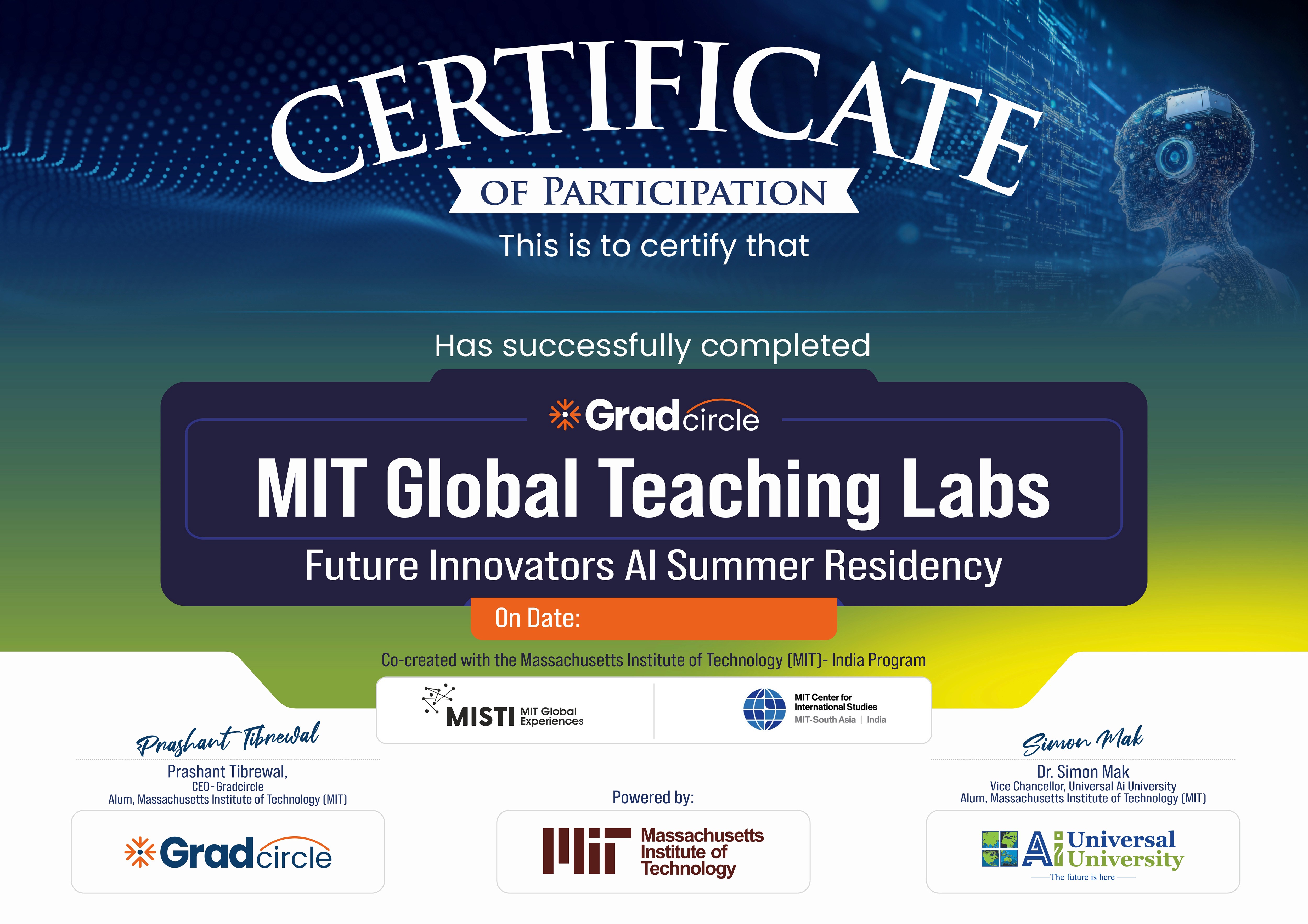 Earn a prestigious certificate endorsed by the MIT Global Teaching Labs and Universal Ai University